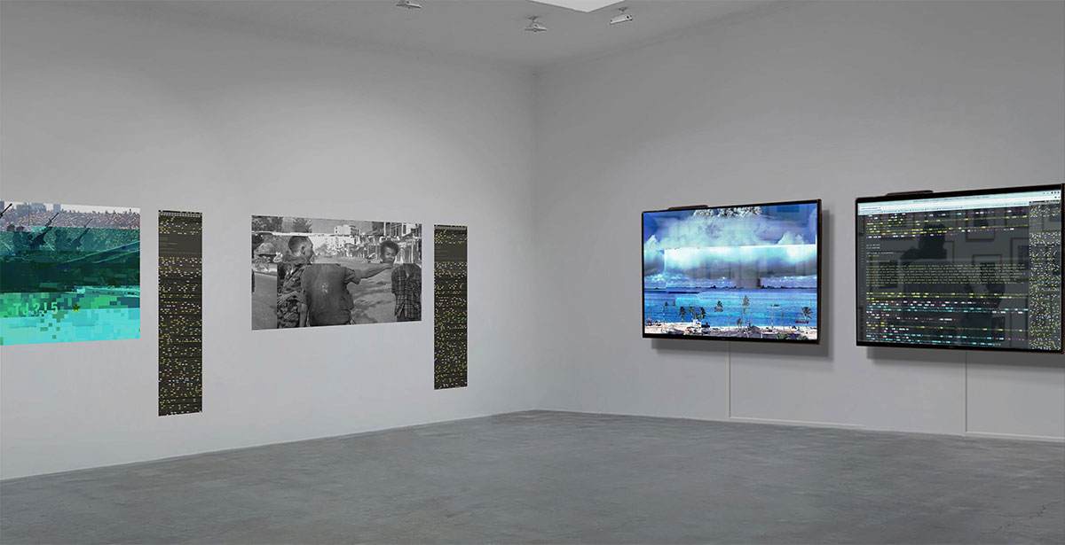 In each work of the series "Becoming Code", a digital image of 1920 x 1080 px is intervened replacing the image code with passages of critical texts. The chosen text is divided into excerpts that are "injected" into several sections of the file. At the time of being exhibited, an impression of the image – as is "read" by a photo editor- is placed next to the printing of the source code - in UTF-8 encoding - so it can be read by the human "interpreter". The video is the recording of the injection process showing the partial results until the critical text assembling is done. Note: The images published on this website have been re-compressed to lighten their weight, so the original code has been altered. |