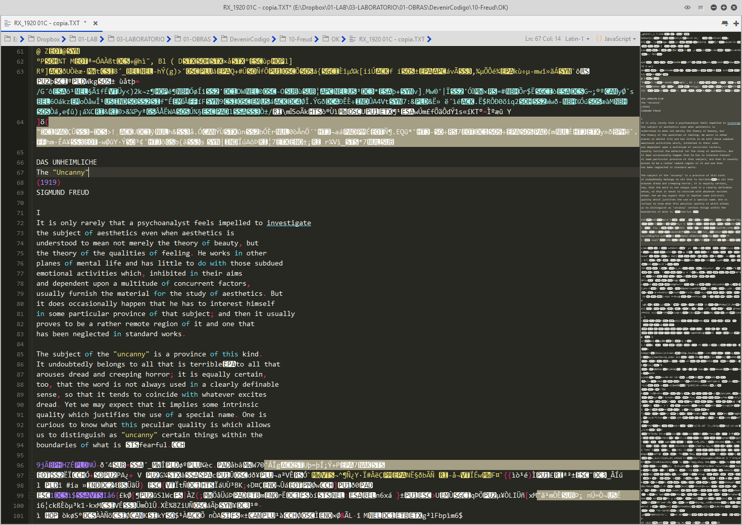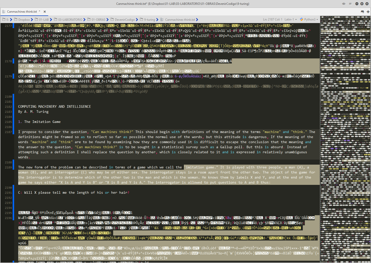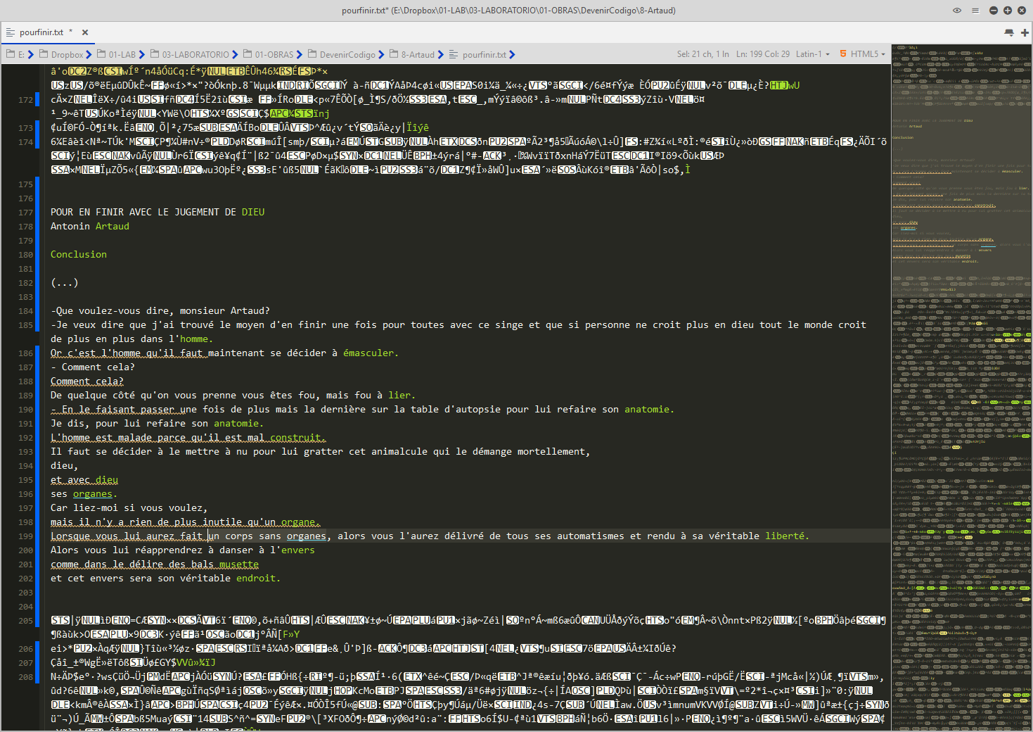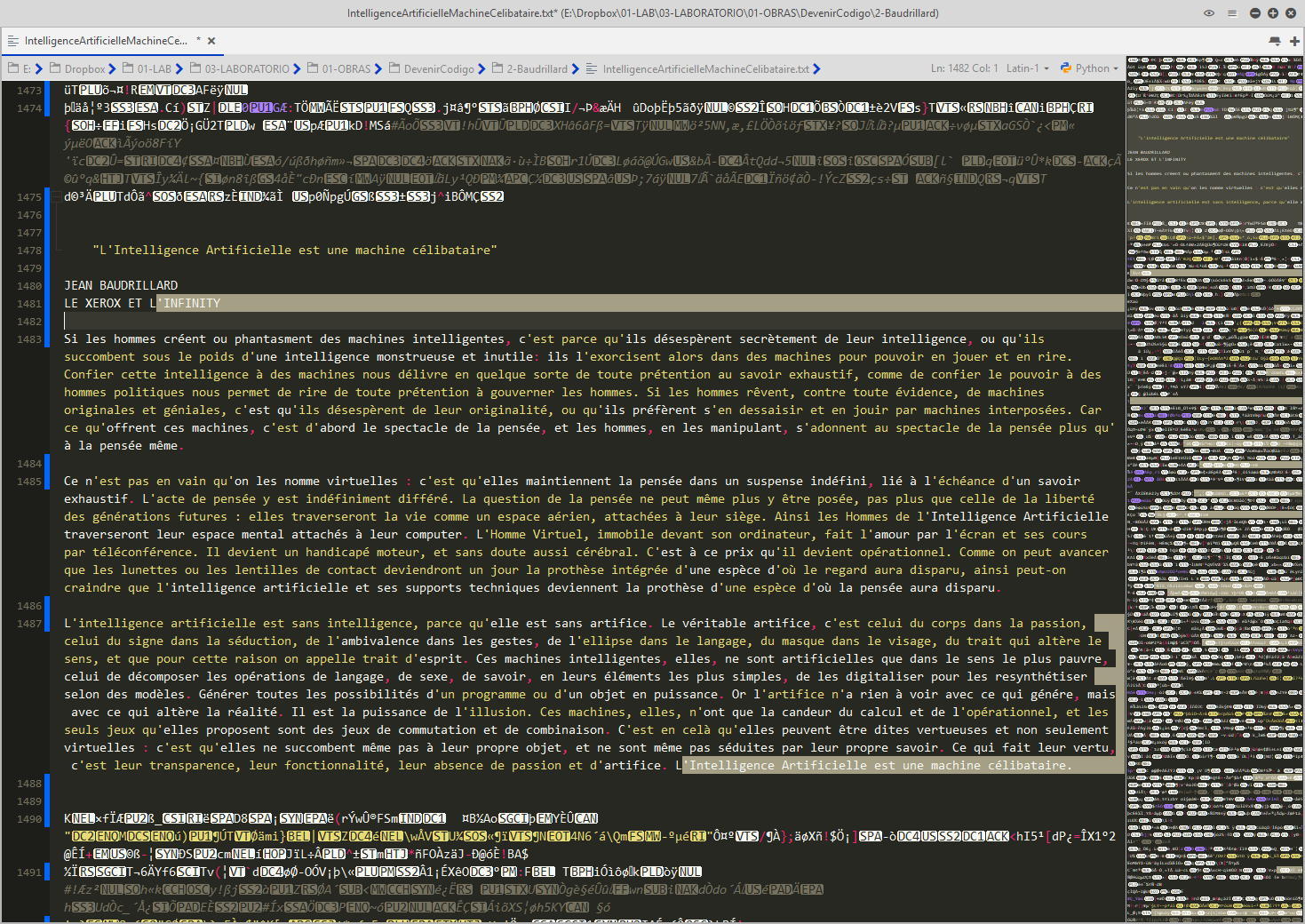 L'Intelligence Artificielle est une machine célibataire JEAN BAUDRILLARD. Excerpts from LE XEROX ET L'INFINITY, in LA TRANSPARENCE DU MAL: ESSAI SUR LES PHENOMENES EXTREMES. Dieu, et avec dieu, ses organes ANTONIN ARTAUD. Excerpts from POUR EN FINIR AVEC LE JUGEMENT DE DIEU. Can machines think? A. M. TURING. Excerpts from COMPUTING MACHINERY AND INTELLIGENCE . Das Intime und das Unheimliche SIGMUND FREUD. Excerpts from DAS UNHEIMLICHE. |